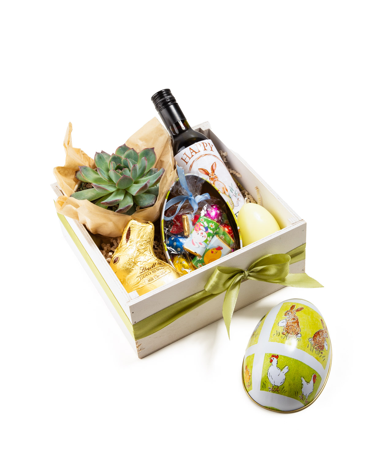 Նվեր տուփը ներառում է՝ - Սուկուլենտ, - Գինի Takar Areni` 187մլ, - Մոմ, - Մետաղական ձվիկ, - Զատիկի թեմատիկ կոնֆետներ, - Շոկոլադե կոնֆետ Lindt նապաստակ: 20x20x6 cm
